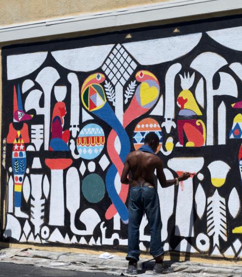 Doran Dada's work celebrates African history. Urban Egyptian-styled hieroglyphics are the focal point of his art. The artwork features the Anubis, the protector of graves, the embalmer. In this case, the Anubis is a dog-headed mummy protecting both sides of the mural.