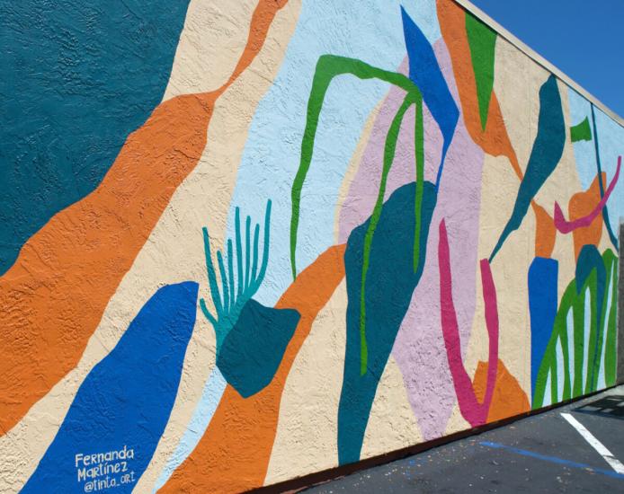 Fernanda Martínez's blocks of color are very abstract. As Fernanda was creating her artwork for the Concord Project, a nearby restaurant patron did not heed the parking curbs and drove their car into the building wall, including a portion of Fernanda's artwork. I met the artist as she was repairing the damaged mural.