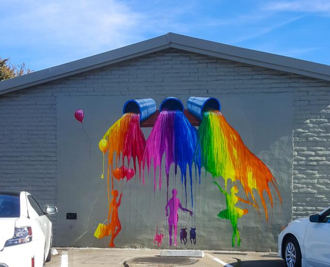 Another wall in Oak Grove Plaza immediately grabs your attention with its splashes of colorful paint spilling out of three cans. It’s also memorable as it was created to honor Oak Grove Plaza founder David Zimmerman by his daughters.