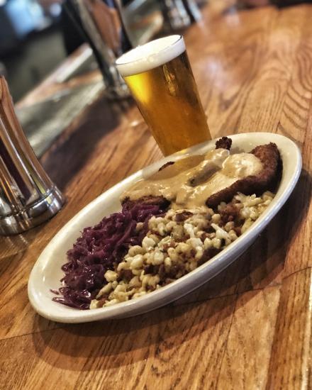 Food Item: Jaegerschnitzel- Bread Pork Loin, pan fried and topped with a creamy mushroom and sour cream demi-glaze. Served with Spaetzle and red cabbage.