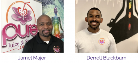 Pure Juice & Smoothie Lounge started as an idea and flourished into a reality, driven by a passion to serve you the healthy options you deserve! Jamel Major and Dr. Derrell Blackburn believe peace, health, and happiness starts from within! Their mission is Mindful Nutrition. We are providing our community a healthy option.