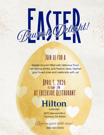Celebrate Easter with Us at Hilton Concord Join us for a festive Easter Brunch at Creekside Restaurant, featuring delicious food, refreshing drinks, and cheerful holiday vibes. Gather your family and friends and make it a celebration to remember.