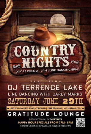 Come on down to Gratitude Lounge (Formerly Cadillac Ranch) for a night of country fun at our Country Nights event! Get ready to kick up your boots, grab a cold one, and enjoy some good ol' country tunes. Whether you're a line dancing pro or just looking to chill with friends, this event is perfect for anyone looking to unwind and have a good time. So dust off your cowboy hat and join us for a night you won't forget!