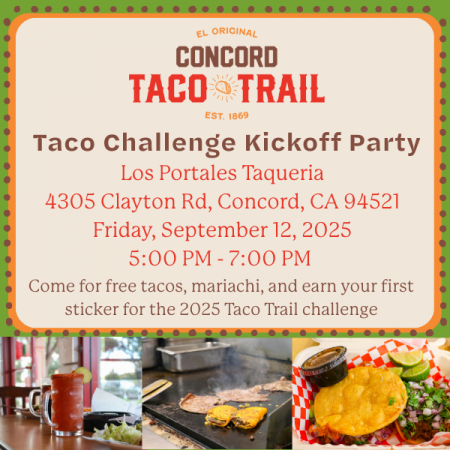 Get ready to taco 'bout a party! Join Visit Concord for our Taco Challenge Kickoff Party on Friday, September 12th, from 5:00 to 7:00 PM at last year's winning taqueria, Los Portales Taqueria (4305 Clayton Rd, Concord, CA 94521). Grab a free taco, enjoy live mariachi music, and earn your first sticker for the 2025 Taco Trail Challenge happening September 15th - October 15th.