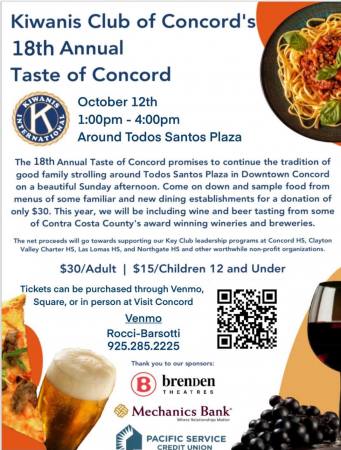 The 18th Annual Taste of Concord promises to continue the tradition of good family strolling around Todos Santos Plaza in Downtown Concord on a beautiful Sunday afternoon. Come on down and sample food from the menus of some familiar and new dining establishments for a donation of only $30. This year, we will be including wine and beer tasting from some of Contra Costa County's award-winning wineries and breweries.